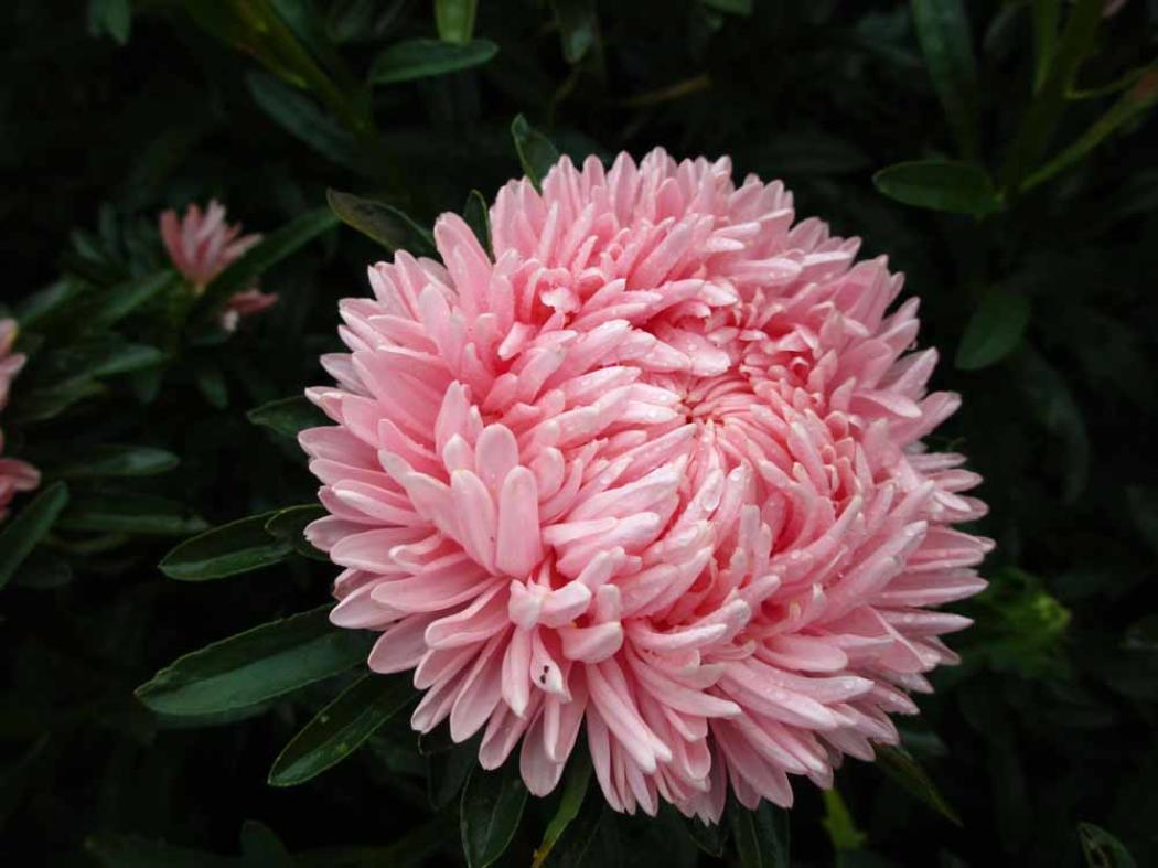 Листва у этой астры темно-зеленая, ланцетовидная, что создает прекрасный контраст с нежно-розовыми соцветиями. Лепестки цветков имеют особую форму – они ладьевидные и загнуты к центру, что придает соцветию объемный и необычный вид. Жесткая структура лепестков обеспечивает устойчивость к дождю, поэтому даже после сильных осадков цветы сохраняют свою привлекательность.