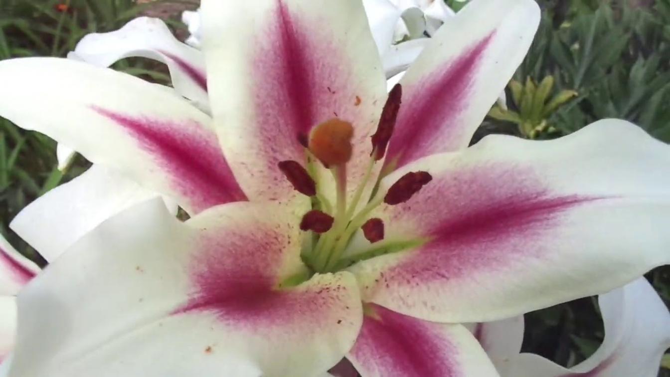 Цветки этой лилии отличаются двухцветной окраской: на белом фоне эффектно выделяются красно-малиновые или розовые мазки, а у основания лепестков заметно зеленоватое горло. Края лепестков слегка волнистые, что придает соцветиям изысканный вид. Немахровые бутоны собраны в крупные соцветия, которые распускаются в средние сроки, обычно в середине лета. Интенсивность цветения обильная — каждый стебель образует несколько бутонов, обеспечивая длительную декоративность. Темные пыльники контрастируют с нежными лепестками, добавляя цветкам выразительности.