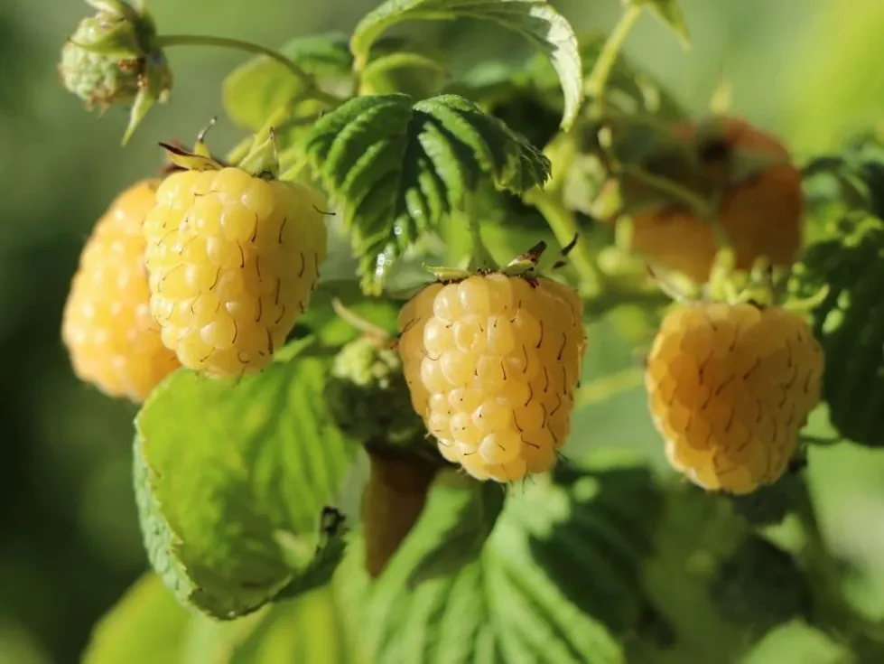 Куст малины Голден Куин отличается раскидистой формой и может достигать высоты до 250 сантиметров. Летом его листья имеют насыщенный зеленый цвет, а осенью они приобретают желтый оттенок, добавляя декоративности саду. Побеги этого растения прямостоячие и покрыты восковым налетом, что придает кусту определенную устойчивость к неблагоприятным условиям. Шипов на растении немного, что облегчает сбор урожая.