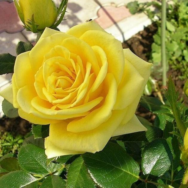 Цветки этой розы обладают уникальной ярко-желтой, почти лимонной окраской, которая сохраняет насыщенность даже под прямыми солнечными лучами. Форма бутона — классическая бокаловидная, а при полном раскрытии он превращается в плоскую розетку диаметром 8–10 см. Каждый цветок состоит из 26–40 лепестков, расположенных равномерно, что придает ему пышность и объем. Распускание происходит постепенно, в течение 12 дней, что продлевает декоративный эффект. Соцветия одиночные, по одному на стебле, что делает их идеальными для срезки. Стойкость в вазе достигает 10–12 суток, а устойчивость к дождю предотвращает повреждение лепестков.