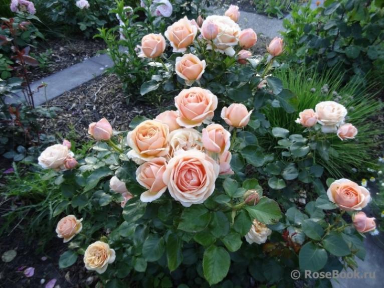 Чашевидные цветки персиково-абрикосового оттенка, состоящие из 82–85 лепестков, формируются как одиночно, так и в соцветиях по 3–5 (иногда до 7) бутонов. Средний размер каждого цветка гармонично сочетается с густой листвой, создавая эффект пышности. Окрас варьируется от нежно-персикового в начале роспуска до теплых абрикосовых тонов в полной фазе. Цветение длится волнами с конца весны до первых заморозков, при этом бутоны долго сохраняют форму и насыщенность цвета даже под дождём, благодаря высокой устойчивости к осадкам.