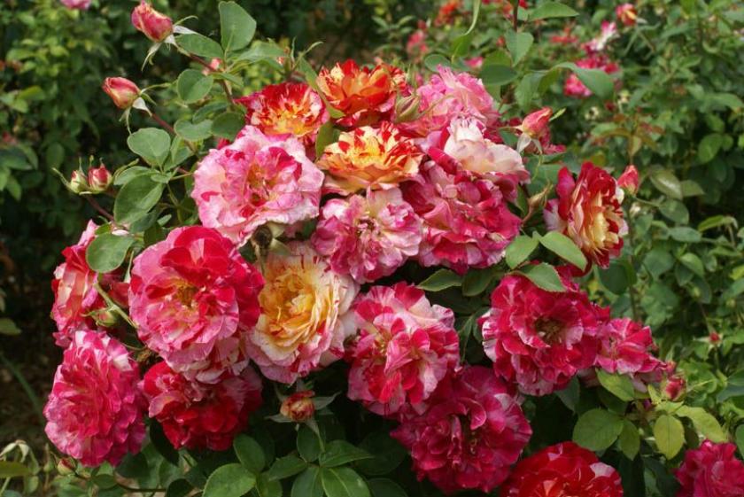 Компактный куст достигает высоты 70–100 см при средней ширине 50 см, что делает его удобным для оформления небольших участков. Ежегодный прирост умеренный, поэтому растение долго сохраняет аккуратную округлую форму. Темно-зеленые листья с глянцевой поверхностью создают контрастный фон для крупных цветков диаметром 8–9 см. Каждый стебель несет 1–3 бутона, которые раскрываются в пышные соцветия. Интересно, что окрас лепестков меняется по мере цветения: изначально желтые с алыми, розовыми и белыми мазками, они постепенно приобретают доминирующий красный оттенок, создавая эффект живого полотна.