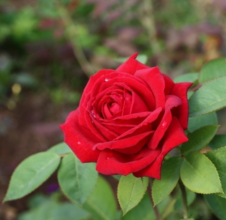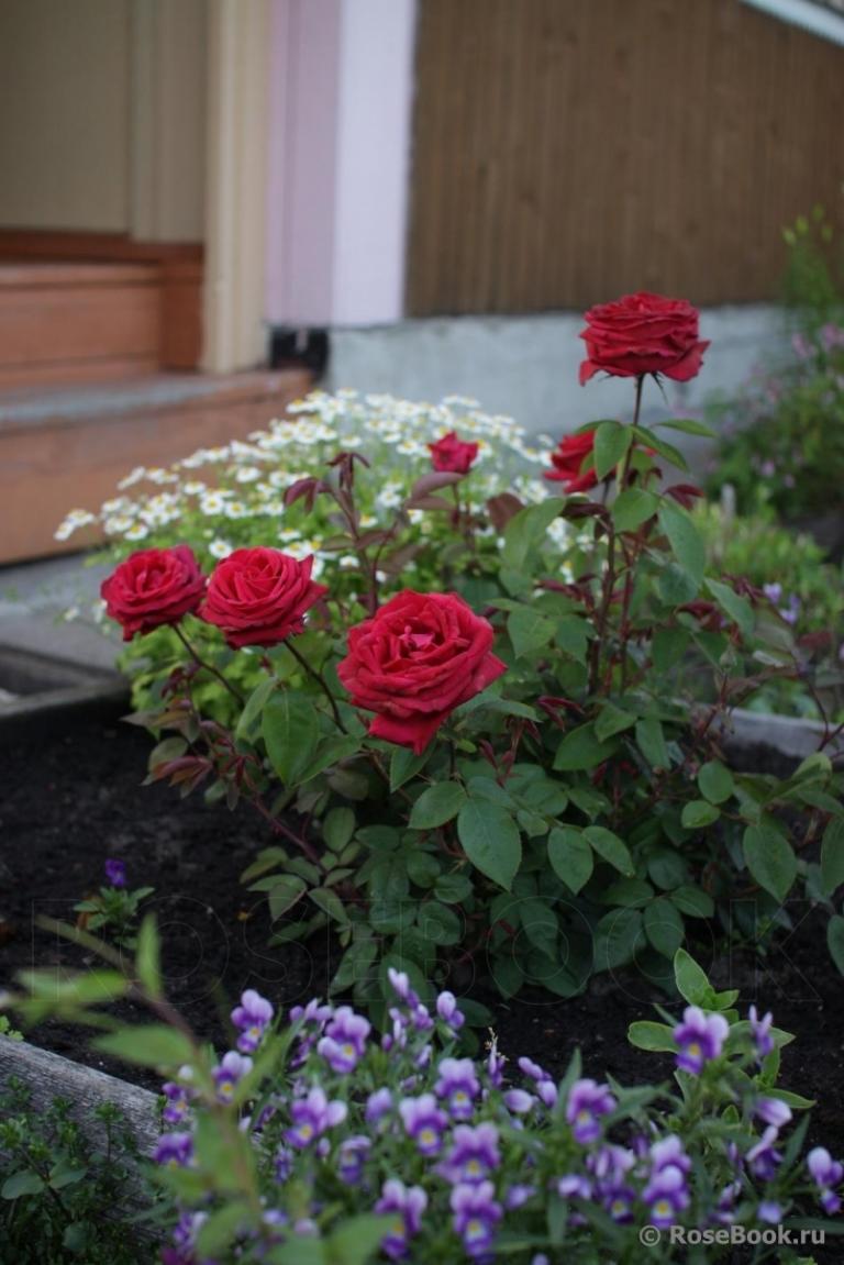 С июля по сентябрь куст покрывается темно-красными цветками классической формы с высоким центром. Каждый бутон, плотный и симметричный, раскрывается в средний по размеру цветок диаметром 8–10 см, состоящий из 40–50 лепестков. Яркость окраса сохраняется на протяжении всего сезона, не выгорая под солнцем. Нежный, но устойчивый аромат дополняет визуальную привлекательность, создавая атмосферу уюта в саду. Цветы расположены одиночно на стеблях, что подчеркивает их изысканную форму.