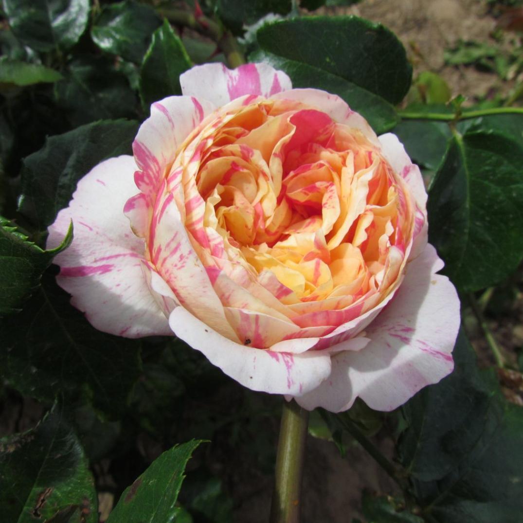 Куст отличается компактной формой, достигая высоты 90–100 см при ширине 60 см. Его тёмно-зелёные листья с глянцевой поверхностью создают контрастный фон для крупных цветков диаметром 9–10 см. Чашевидная форма с высоким центром придаёт бутонам изысканную бокаловидную форму. Раскрываясь, они демонстрируют 20–25 лепестков кремово-жёлтого оттенка, украшенных красно-розовыми и оранжевыми полосами. Такой пёстрый окрас сохраняется на протяжении всего периода цветения, который длится с июня по октябрь.