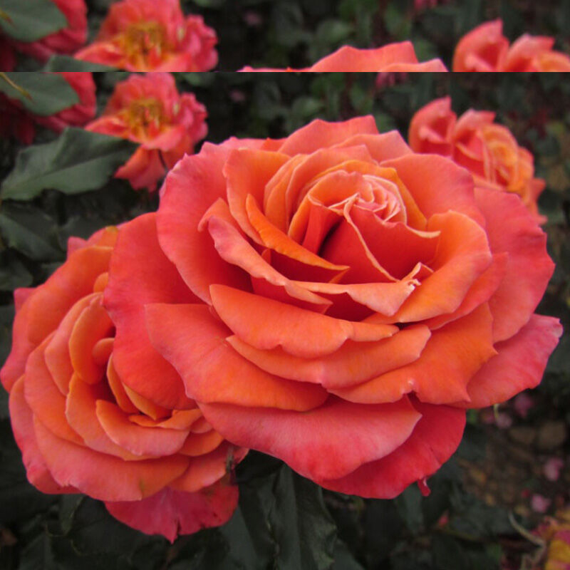 Куст отличается прямыми побегами, достигающими максимальной высоты 120 см при ширине 50–60 см. Молодая листва привлекает внимание темно-пурпурным оттенком, который со временем становится более насыщенным, а гладкая поверхность листьев обладает выраженным блеском. Крупные цветки диаметром 12–14 см имеют красно-оранжевую окраску с медными переливами, создавая эффект двуцветности. Каждый бутон состоит из 17–25 лепестков, расположенных плотно, но с изящной воздушностью. Цветы формируются как одиночно, так и в соцветиях по 1–3 штуки на стебле, что добавляет кусту объемности.