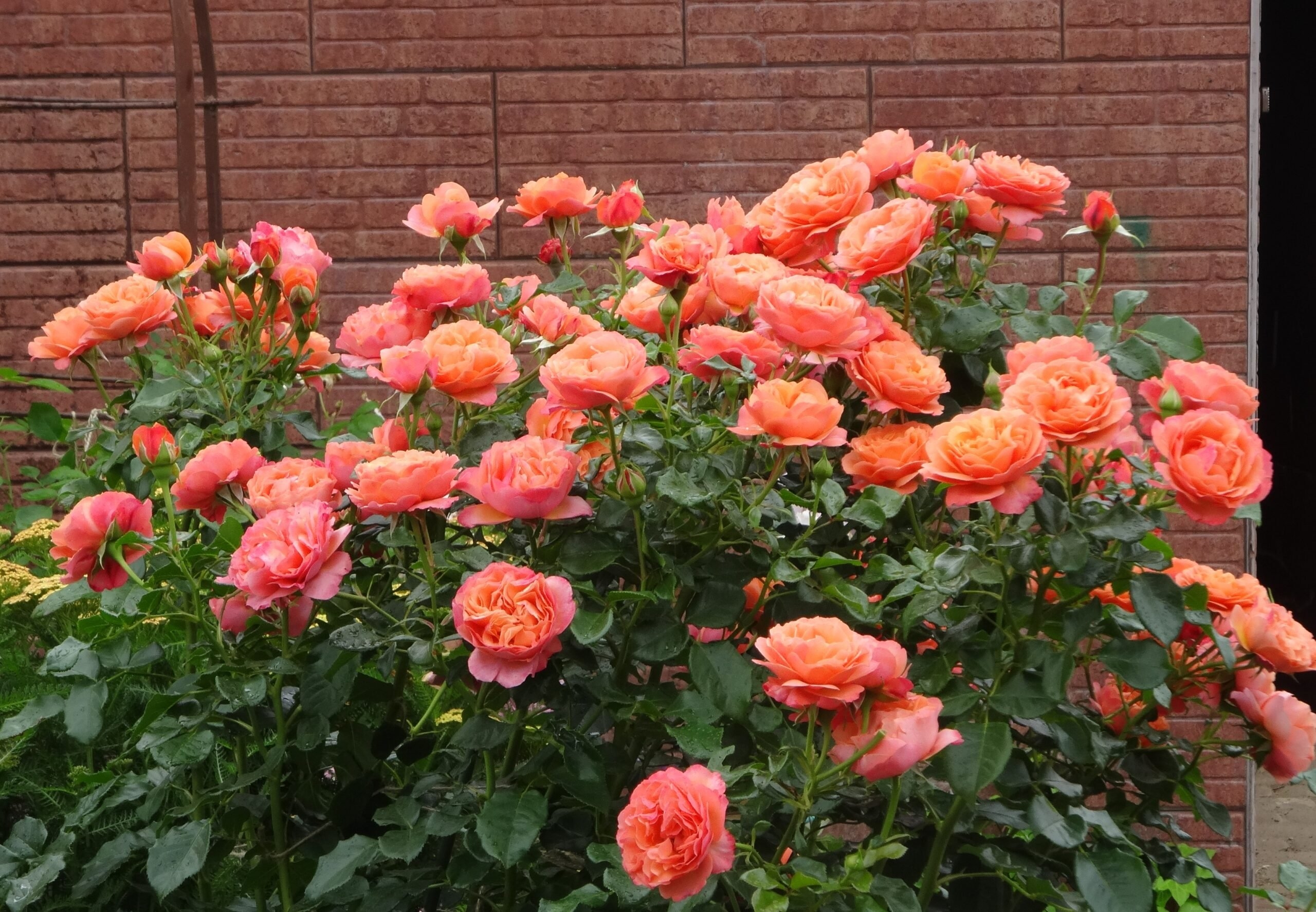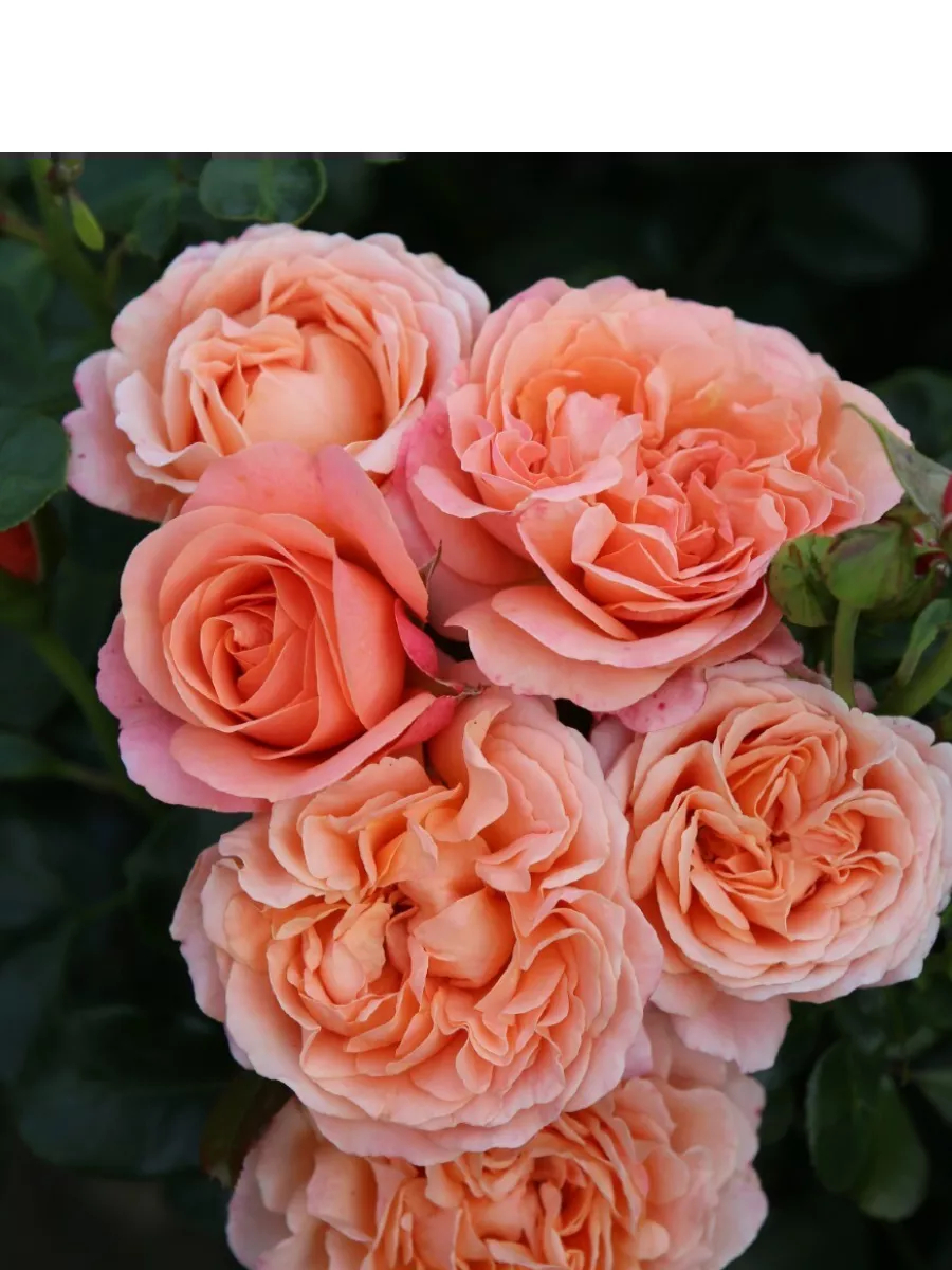 Цветки чашевидной формы, среднего размера (7–8 см в диаметре), состоят из 17–25 лепестков. Их окрас — сложный градиент: основание бутона оранжевое, при распускании переходит в абрикосово-лососево-розовые оттенки с тонкой персиковой каймой. Насыщенность цвета сохраняется на протяжении всего сезона, не выгорая под солнцем. Соцветия собраны в небольшие кисти по 3–5 штук, что усиливает декоративный эффект.
