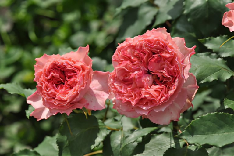 Цветки этой розы отличаются правильной чашевидной формой: лепестки с острыми, слегка приподнятыми краями спирально расходятся от центра, создавая эффект объемной структуры. Диаметр каждого цветка достигает 8–10 см, а его окрас плавно переходит от насыщенного розового в сердцевине к нежному светло-розовому по краям. Благодаря такой градиентной окраске бутоны выглядят особенно нежно. Цветы собраны в соцветия по 2–3 штуки на стебле, что усиливает визуальную пышность. Средний размер цветков и их матовая поверхность листьев подчеркивают изящество куста.