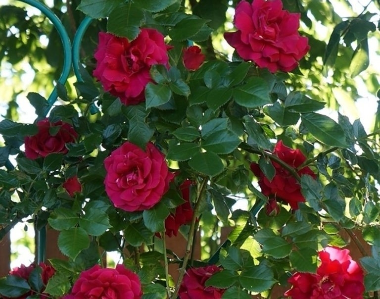Соцветия располагаются как одиночно, так и в группах по 3–5 штук на одном стебле, что обеспечивает эффект непрерывного цветения. Куст раскидистый, с мощными побегами, требующими опоры. Без горизонтальной подвязки стеблей добиться обильного цветения сложно — такая техника стимулирует образование новых бутонов. Максимальная высота растения достигает 365 см, а ширина — 200 см, поэтому для него необходимо выделить достаточно пространства. Ежегодный прирост составляет около 50–70 см, что характерно для плетистых групп. Густая листва темно-зеленого цвета с глянцевой поверхностью служит контрастным фоном для ярких цветов.