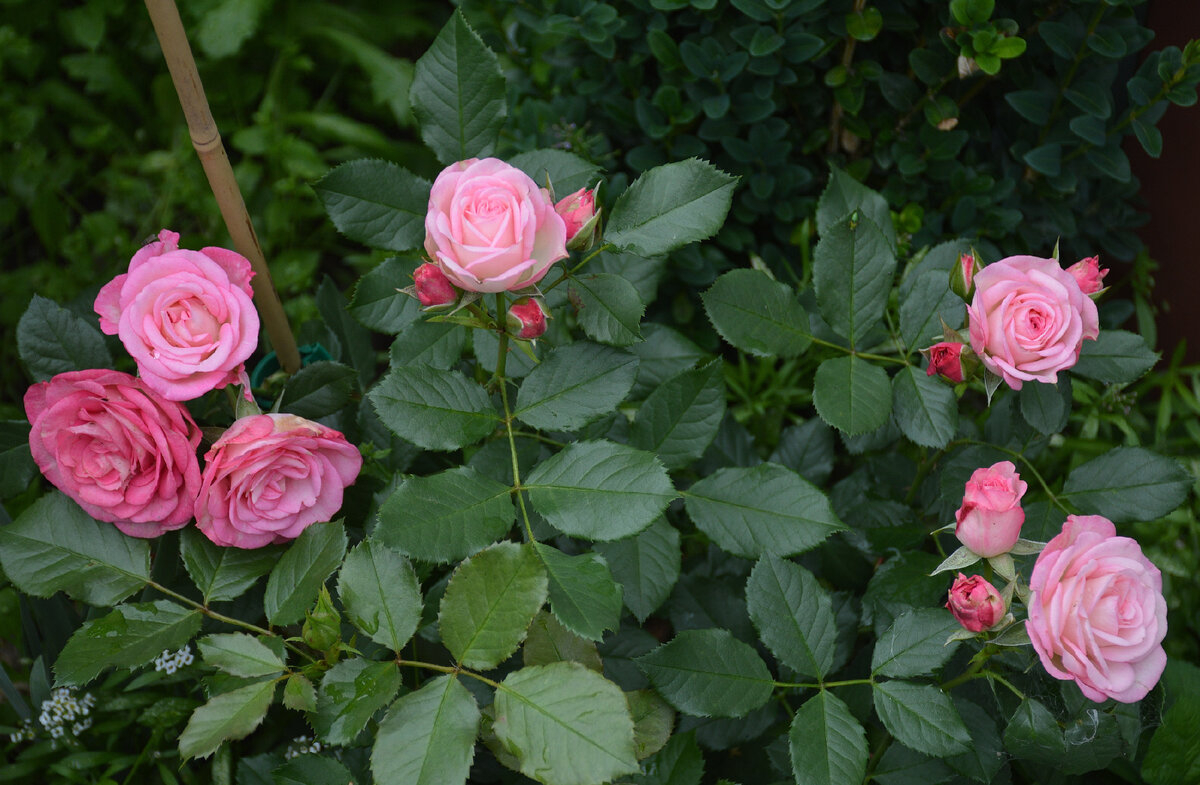 Чашевидные цветки среднего размера (4–5 см в диаметре) собраны в пышные соцветия по 12–15 штук на одном стебле. Их яркий розовый окрас дополняется светлой оборотной стороной лепестков, создавая эффект мягкого свечения. Несмотря на отсутствие пёстрой окраски или двухцветных переходов, растение привлекает внимание насыщенностью тона и гармоничным сочетанием оттенков. Цветение продолжается волнами с июня до первых заморозков, причём бутоны раскрываются постепенно, обеспечивая декоративность в течение всего сезона.