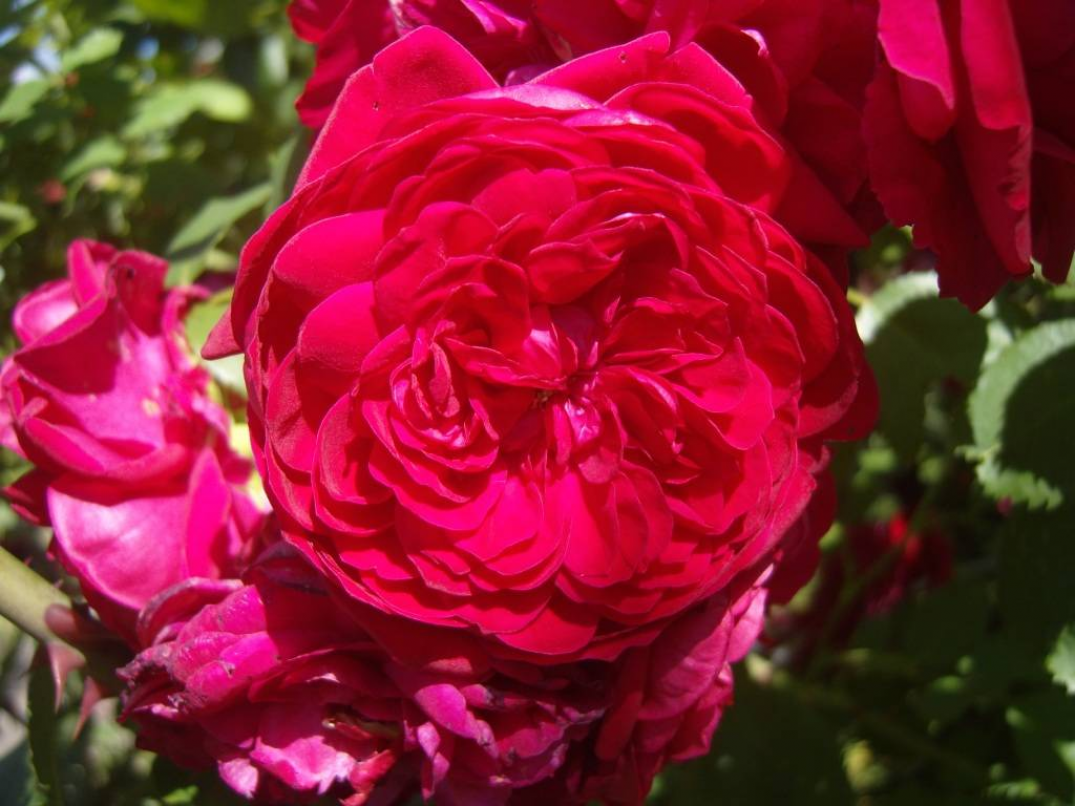 Пионовидные цветки среднего размера (7–8 см в диаметре) состоят из 66 лепестков, формирующих пышные, махровые соцветия. Бутоны раскрываются в насыщенно-красных тонах, но под воздействием солнца постепенно выгорают, приобретая светло-красные оттенки. Аромат мягкий, с фруктовыми нотками, не overpowering. Цветение начинается в июле-августе и продолжается до поздней осени, при этом цветки располагаются одиночно или группами по 1–4 на стебле.