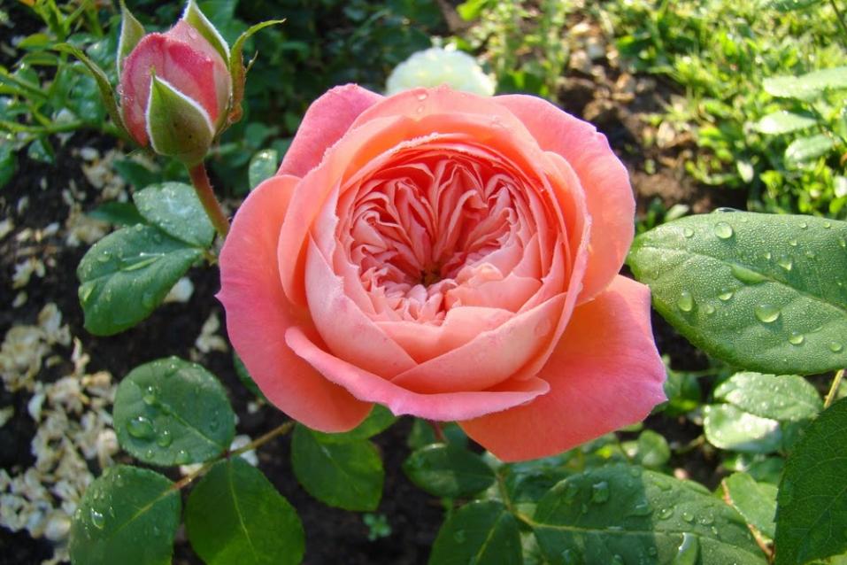 Куст отличается вертикальным и компактным габитусом, достигая высоты 70–90 см при ширине 40–60 см. Крупные тёмно-зелёные листья с полуглянцевой поверхностью создают контрастный фон для соцветий. Цветки блюдцевидной формы, диаметром 8–10 см, состоят из 120 лепестков, что придает им объем и плотность. Окрас варьируется от лососево-оранжевого до розоватых оттенков, при этом бутоны раскрываются постепенно, демонстрируя переход от тёмно-розово-лососевого к нежным тонам. Цветы располагаются по одному или в небольших группах до 3 штук на стебле, сохраняя свежесть долгое время даже под дождем.