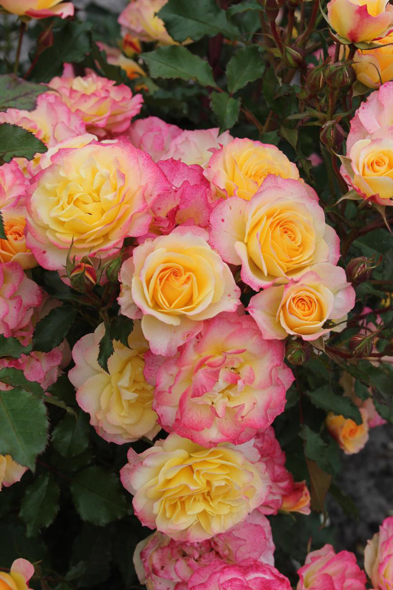 Цветки розетковидной формы с яйцевидными бутонами распускаются в соцветиях по 3–5 штук на одном стебле. Каждый бутон имеет оранжево-красный оттенок, который при раскрытии превращается в абрикосово-жёлтый с розовым подтоном и малиновой каймой. По мере цветения лепестки постепенно светлеют до желтого, сохраняя тёмно-розовую окантовку. Диаметр цветков — 7–9 см, а количество лепестков варьируется от 19 до 26, что обеспечивает пышность и объём. Период цветения длится с июня по октябрь, при этом культура не теряет интенсивности даже в дождливую погоду благодаря высокой устойчивости к влаге.