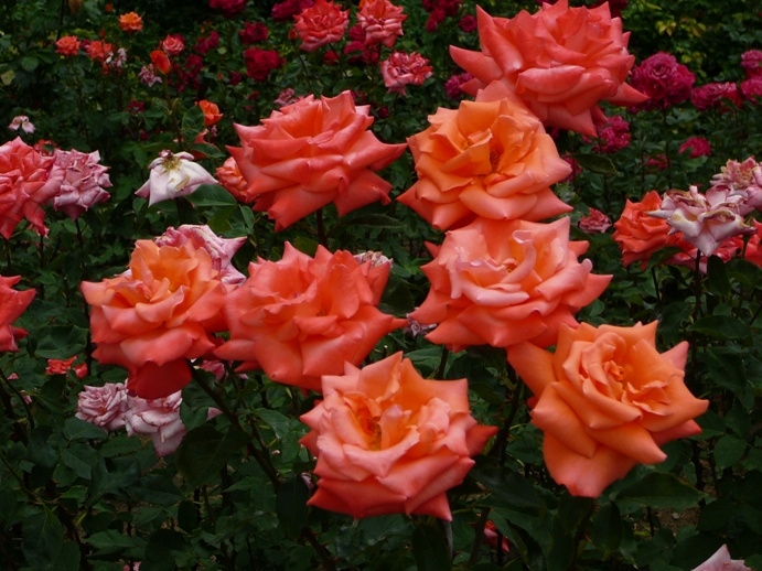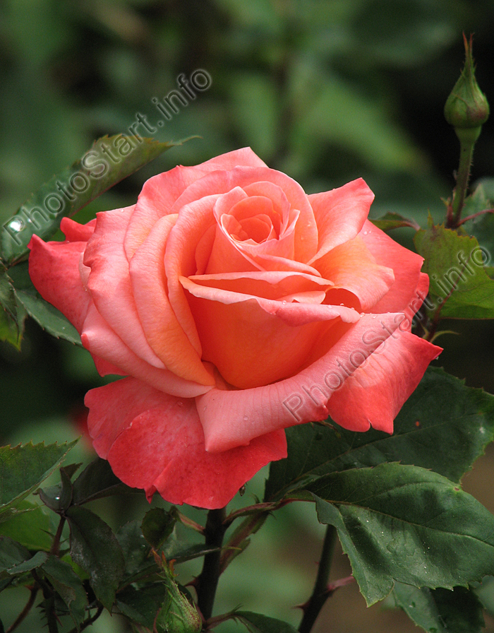 Компактный куст достигает высоты 150 см при ширине 70 см, сохраняя аккуратную форму даже без регулярной формирующей обрезки. Крупные темно-зеленые листья с глянцевой поверхностью создают эффектный фон для соцветий. Молодая листва выделяется бронзовым оттенком, добавляя растению контрастности в начале вегетационного периода. Цветки диаметром 10–11 см имеют чашевидную форму с классическим силуэтом бутона. Их окрас — сложный градиент: яркие лососево-оранжево-розовые лепестки с желтым основанием создают эффект двухцветности. На одном стебле распускается 3–5 бутонов, которые могут располагаться как одиночно, так и в соцветиях.