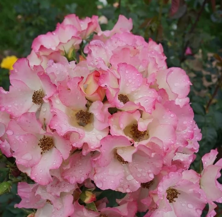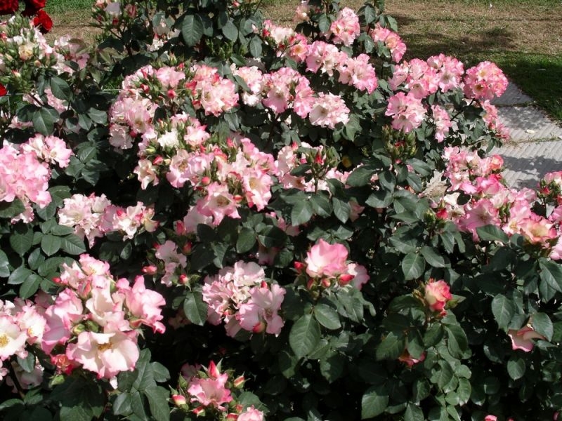 Главная гордость этого сорта — обильное цветение, которое длится с начала лета до поздней осени. Средние по размеру цветки, собранные в пышные соцветия по 5–10 штук на одном стебле, привлекают внимание кремово-розовой палитрой. Каждый бутон состоит из 4–8 лепестков с волнистыми краями, где нежно-розовая кайма мягко переходит в кремовую основу. Матовые темно-зеленые листья диаметром 5–7 см создают контрастный фон, подчеркивая воздушность соцветий. В пасмурную погоду оттенки лепестков становятся более насыщенными, а на солнце приобретают перламутровый блеск.