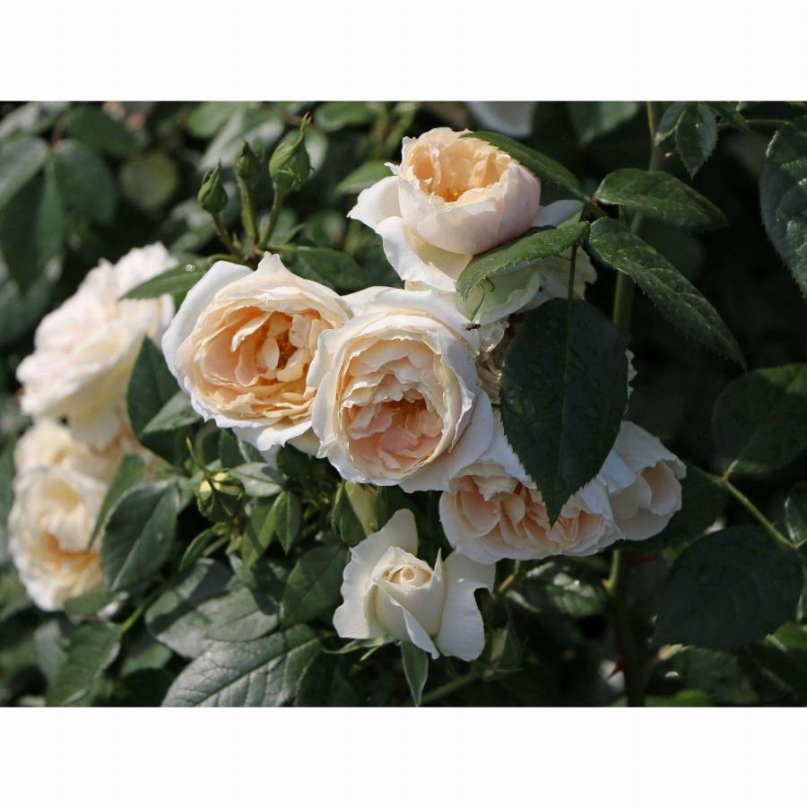 Цветки чашевидной формы, среднего размера (7–9 см в диаметре), собраны в соцветия по 3–5 штук. Каждый бутон состоит из 60–75 лепестков, которые раскрываются постепенно, демонстрируя кремовую основу с нежным абрикосово-розовым оттенком. Окрас может варьироваться в зависимости от освещения: в полутени преобладают пастельные тона, а на солнце проявляется лёгкая перламутровая игра. Аромат сладковатый, ненавязчивый, с фруктовыми нотками, что делает растение идеальным для посадки возле зон отдыха. Период цветения длится с июня до первых заморозков, волны следуют непрерывно при правильном уходе.