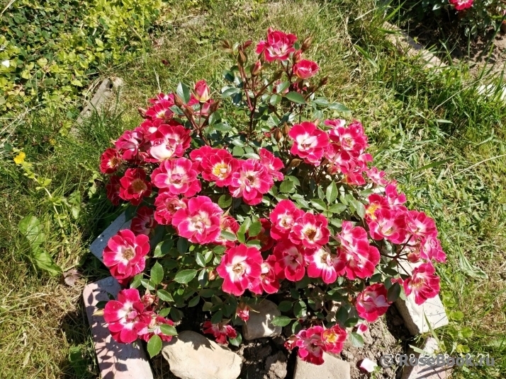 Куст формируется низким — его высота не превышает 50 см, а ширина достигает 40 см. Побеги преимущественно прямостоячие, но из-за раскидистой формы растение приобретает округлые очертания, создавая эффект аккуратного шара. Листва густая, с насыщенно-зелёным оттенком, что подчёркивает контраст с цветами. Мелкие бутоны, диаметром 3–4 см, собраны в кисти по 5–10 штук. Каждый цветок состоит из 14–24 лепестков, которые меняют интенсивность окраски в течение сезона: от ярко-красного с хаотичными светлыми штрихами до более глубоких тонов с золотистыми переливами.