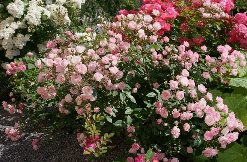 Куст отличается среднерослостью, достигая в высоту 100–150 см при максимальных значениях до 150 см, а в ширину разрастается до 100 см. Годовой прирост умеренный, что позволяет сохранять компактную форму без частой корректировки. Мелкие светло-зелёные листья с матовой поверхностью создают изящный фон для соцветий. Цветки, диаметром 3–4 см, собраны в пышные кисти по 5–10 штук на одном стебле. Их шаровидная форма подчеркивается плотным расположением 40–60 лепестков. Изначально нежно-розовые бутоны постепенно выгорают до почти белого оттенка, создавая эффект градиента на кусте. Отсутствие пёстрой окраски делает растение универсальным элементом садовых композиций.