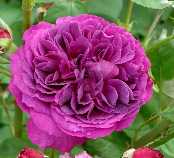 Цветки чашевидной формы, среднего размера (8–10 см в диаметре), с густой махровостью — каждый бутон состоит из более чем 40 лепестков. Окрас варьируется от нежно-сиреневого до пурпурно-фиолетового, создавая эффект градиента в зависимости от освещения. Цветы располагаются как одиночно, так и в небольших соцветиях по 1–3 штуки на стебле. Продолжительность цветения — с конца мая до первых заморозков, при этом интенсивность остаётся стабильно высокой.