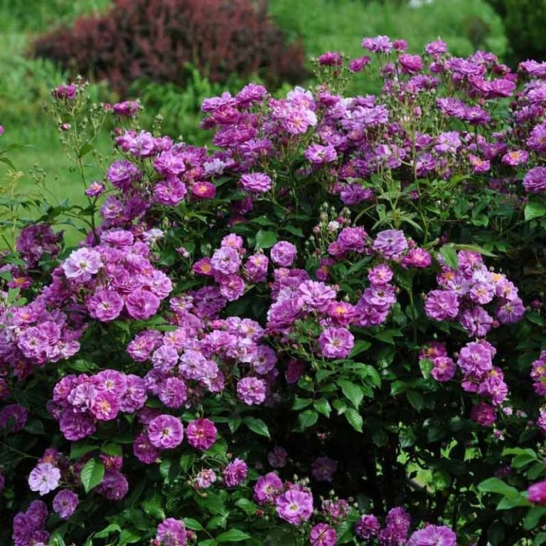 Роза Перпл Рейн, созданная немецкими селекционерами из питомника Kordes в 2009 году, отличается аккуратной и компактной формой. Куст низкий, но при этом широкий — его высота достигает 80–100 см, а диаметр варьируется от 60 до 80 см. Среднегодовой прирост зависит от условий выращивания, но обычно растение сохраняет пропорции, формируя густую, равномерную крону. Листья полуглянцевые, насыщенного зеленого оттенка, создают эффектный контраст с цветами. Поверхность листовых пластин устойчива к внешним воздействиям, что подчеркивает декоративность культуры даже вне периода цветения.