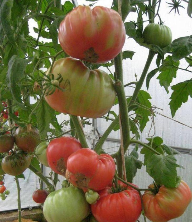 Плоскоокруглые плоды этого сорта выделяются малиновым оттенком кожицы и очень крупными размерами — средний вес достигает 300–500 г. Мякоть плотная, мясистая, с минимальным количеством семян, что делает урожай идеальным для приготовления соусов, паст и консервации. Плоды универсальны: их используют как в свежем виде, так и для термической обработки. При соблюдении агротехники с одного куста можно собрать до 6–8 кг томатов.