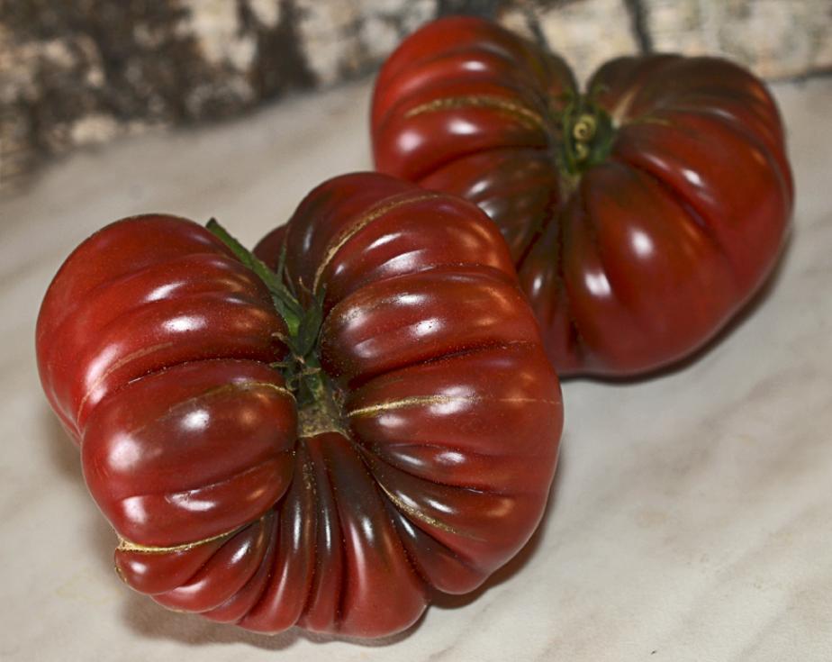 Плоскоокруглые плоды этого растения выделяются пурпурно-фиолетовым окрасом в стадии полной зрелости. Их размер варьируется от крупного до очень крупного — отдельные экземпляры могут весить более 500 г. Мякоть плотная, но сочная, с насыщенным сладковатым вкусом и необычным помидорно-фруктовым послевкусием, напоминающим нотки тропических фруктов. Такие особенности делают плоды идеальными для употребления в свежем виде, а также для засолки, консервирования, вяления и сушки.