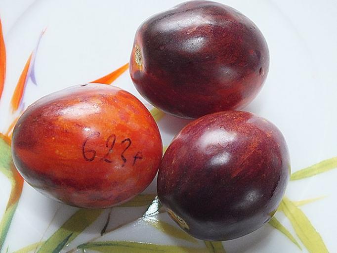 На начальной стадии созревания плоды имеют ярко-фиолетовый цвет с выраженными полосками и штрихами. По мере достижения зрелости их окраска становится почти черной, с добавлением оранжевых и темных прожилок, создающих эффект мраморности. Форма плодов овальная, слегка вытянутая, с гладкой поверхностью. Размер относится к категории коктейльных — компактный, удобный для употребления в свежем виде. Мякоть светло-красная, плотная, но при этом сочная, с выраженным сладким вкусом, лишенным кислинки. Благодаря высокой сахаристости и небольшому диаметру плоды идеально подходят для засолки, консервирования и приготовления витаминных салатов.