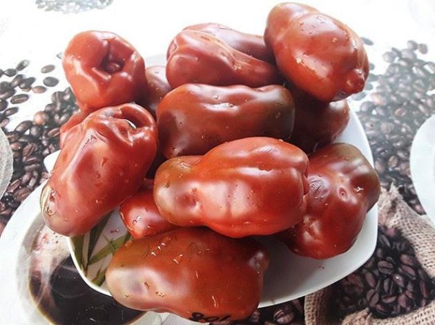 Перцевидная форма плодов, часто с гранями и небольшим носиком или ямкой на вершине, придает им декоративный вид. Кожица в зрелом состоянии приобретает коричневый оттенок, иногда с оливковыми плечиками, что делает растение популярным среди любителей экзотических сортов. Мякоть плотная, мясистая, с розовым оттенком и минимальным количеством семян. Вкус насыщенный, сбалансированный между сладостью и легкой кислинкой, что высоко ценится в кулинарии.