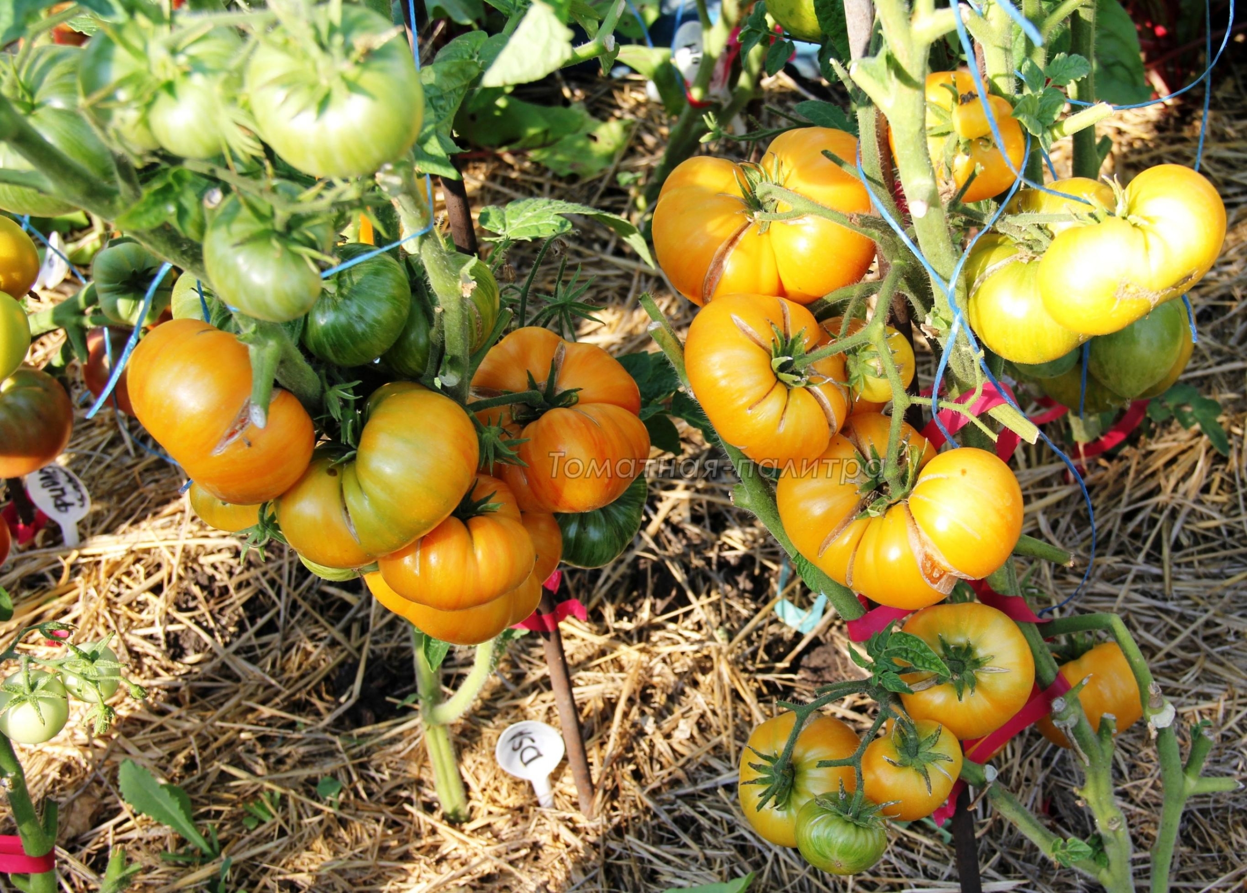 Плоды отличаются плоскоокруглой формой, а их размер варьируется от среднего до очень крупного. При созревании кожица приобретает желто-оранжевый оттенок с множеством малиновых и красных полос, которые постепенно переходят в розоватый тон. Мякоть имеет насыщенный желто-оранжевый цвет с ярким пятном в центре. На каждой кисти формируется 5–6 плодов, что обеспечивает обильное плодоношение. Благодаря плотной структуре, они обладают высокой транспортабельностью и сохраняют товарный вид даже при длительном хранении.