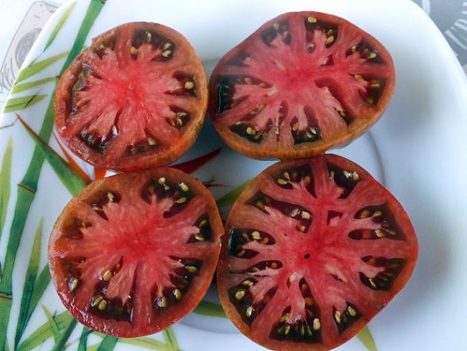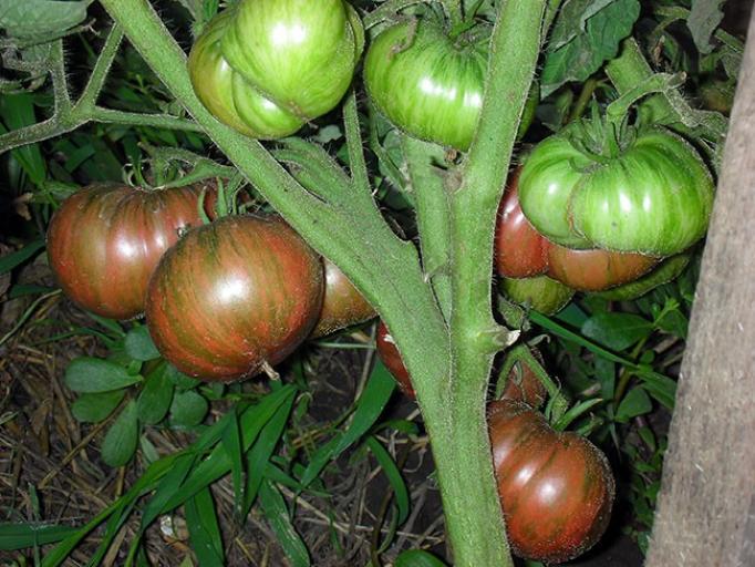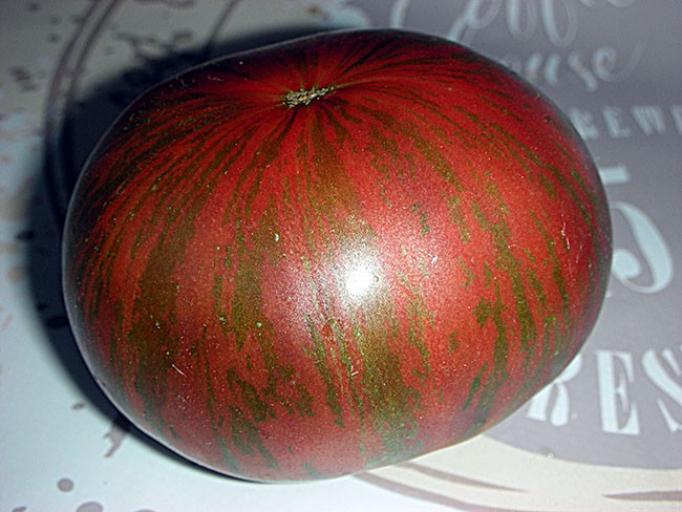 Плоды этой культуры отличаются плоскоокруглой формой с выраженной ребристостью у основания. В зрелом состоянии они приобретают розово-пурпурный оттенок с вертикальными оливково-зелеными полосами, создающими эффектный контраст. Мякоть красно-розовая, мясистая, с минимальным количеством семян. Листья морщинистые, с регулярным расположением на стебле, что подчеркивает декоративность растения. Куст редко превышает 100 см в теплицах, а в открытом грунте его высота составляет 50–60 см. Среднеспелый срок созревания позволяет получать урожай через 110–120 дней после всходов.