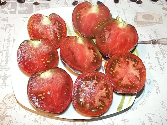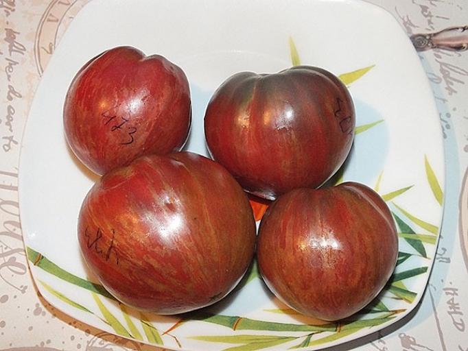 Плоды сердцевидной формы, слегка вытянутые, с выраженным «носиком» на конце, что добавляет им визуальной оригинальности. Средний размер плодов компенсируется их количеством: благодаря дружному созреванию, куст буквально усыпан томатами. Кожица тонкая, но плотная, устойчивая к растрескиванию. В стадии полной зрелости плоды приобретают необычный бордово-розовый окрас с перламутровыми штрихами и полосками, что делает их украшением сада. Мякоть сочная, с коричнево-бордовым оттенком, обладает сбалансированным вкусом — сладость сочетается с легкой кислинкой, характерной для классических томатов.