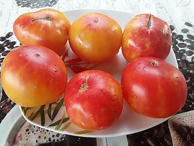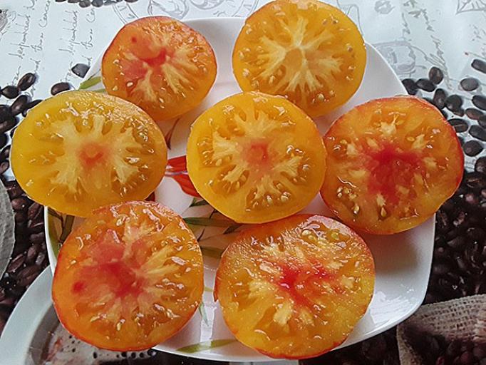 Плоскоокруглые плоды среднего размера выделяются необычным жёлто-красным окрасом с переливами, напоминающими абстрактные узоры. Мякоть жёлто-оранжевая, с розоватой сердцевиной и разводами, плотная, мясистая и сочная. Вкус доминирует сладкими фруктовыми нотами, дополненными пряным томатным ароматом, что делает урожай универсальным в применении: от свежих салатов до консервации и приготовления соков. Урожайность достигает 4 кг с одного куста при соблюдении агротехники.