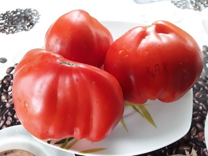 Плоды отличаются сердцевидной формой с выраженной ребристостью у основания. В стадии зрелости они приобретают равномерный розовый оттенок, а в недозрелом состоянии имеют светло-зелёную окраску с тёмным пятном у плодоножки. Мякоть средней плотности, сочная, с нежной текстурой и насыщенным сладковатым вкусом, в котором ярко выражены томатные нотки. В каждом плоде формируется более шести камер, что характерно для крупноплодных сортов. На одной кисти созревает от 3 до 5 экземпляров, что обеспечивает компактное распределение урожая на кусте.