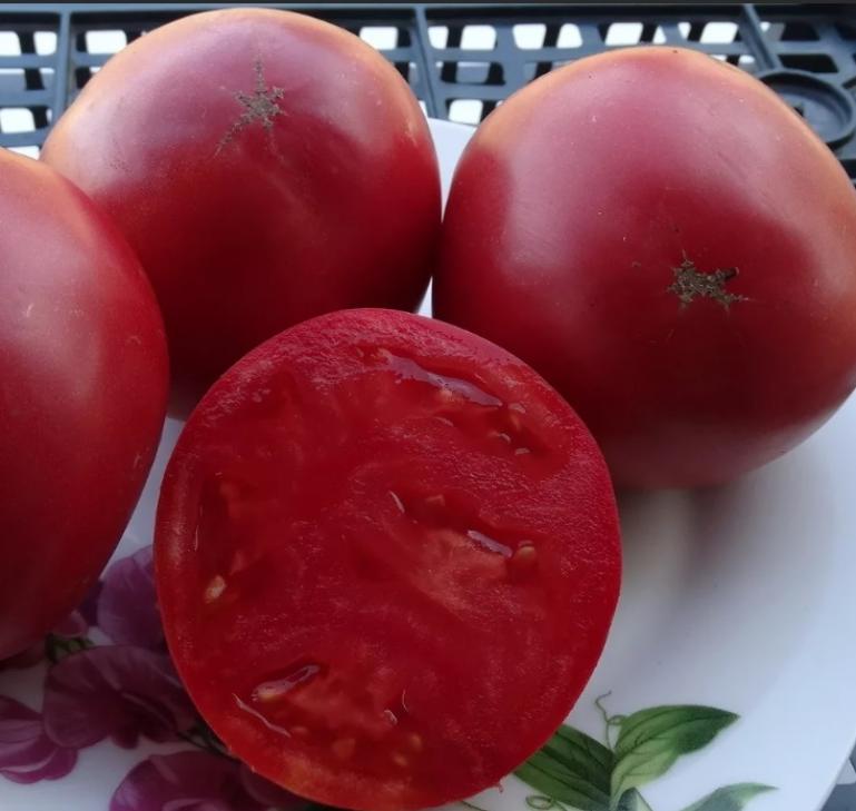 Зрелые экземпляры отличаются малиново-розовым оттенком и плоскоокруглой формой со слабовыраженными рёбрами. Их плотная глянцевая кожица защищает сочную, сахаристую мякоть с минимальным количеством семян. Средний вес плодов достигает 300–600 г, а при оптимальных условиях — до 1 кг. Благодаря сбалансированному сладкому вкусу и насыщенному аромату они идеальны для свежих салатов, приготовления соков, кетчупов и паст. Плотная структура мякоти сохраняется при термической обработке, что делает сорт популярным для засолки и консервирования.