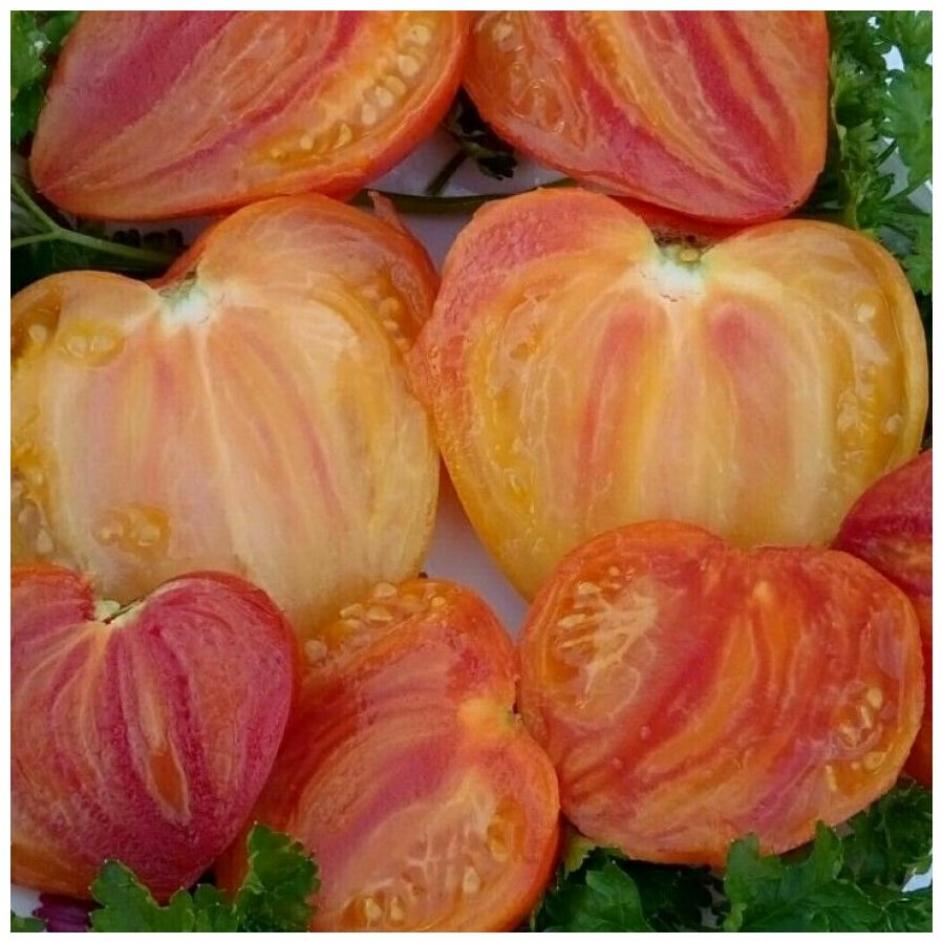 Плоды отличаются сердцевидной формой с выраженным носиком на вершине и очень крупными размерами — отдельные экземпляры могут достигать 500–700 г. Мякоть плотная, но рыхловатая, с желеобразной текстурой, практически без свободной жидкости. Это делает её идеальной для приготовления густых соусов, кетчупов и томатной пасты, хотя плоды также употребляют свежими благодаря сладкому вкусу с фруктовыми нотками и полным отсутствием кислинки. Окраска варьируется от классического красного до солнечно-жёлтого и ярко-оранжевого, добавляя блюдам эстетической привлекательности.