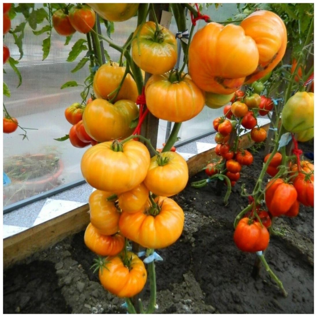 Плоскоокруглые плоды этого сорта привлекают внимание не только размером — их масса часто превышает 600-800 г, — но и необычной окраской. В фазе полной зрелости кожица приобретает оранжевый фон с малиновыми разводами, создающими мраморный эффект. Мякоть сочетает плотность и сочность, что делает томаты идеальными для нарезки, приготовления соков или соусов. Вкус выраженно сладкий, с легкими фруктовыми нотками, которые усиливаются при полном созревании на кусте.