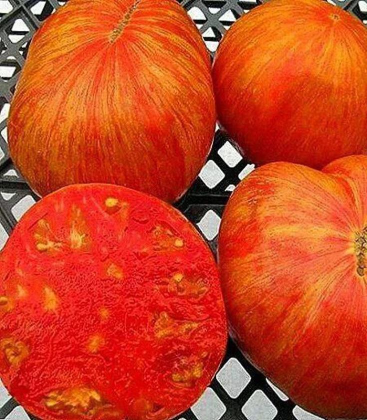 Томат Король красоты выделяется среди других сортов своей декоративностью и урожайностью. Это среднеспелый сорт, период от всходов до сбора первых плодов составляет 110-120 дней. Плоскоокруглая форма плодов, напоминающая приплюснутый шар, сочетается с их крупными размерами — средняя масса достигает 300-500 г. Оранжевая кожица с алыми штрихами придает томатам экзотический вид, а мясистая мякоть с минимальным количеством семян делает их идеальными для употребления в свежем виде. Сладкий вкус с легкой кислинкой сохраняется даже при выращивании в условиях недостаточной освещенности.
