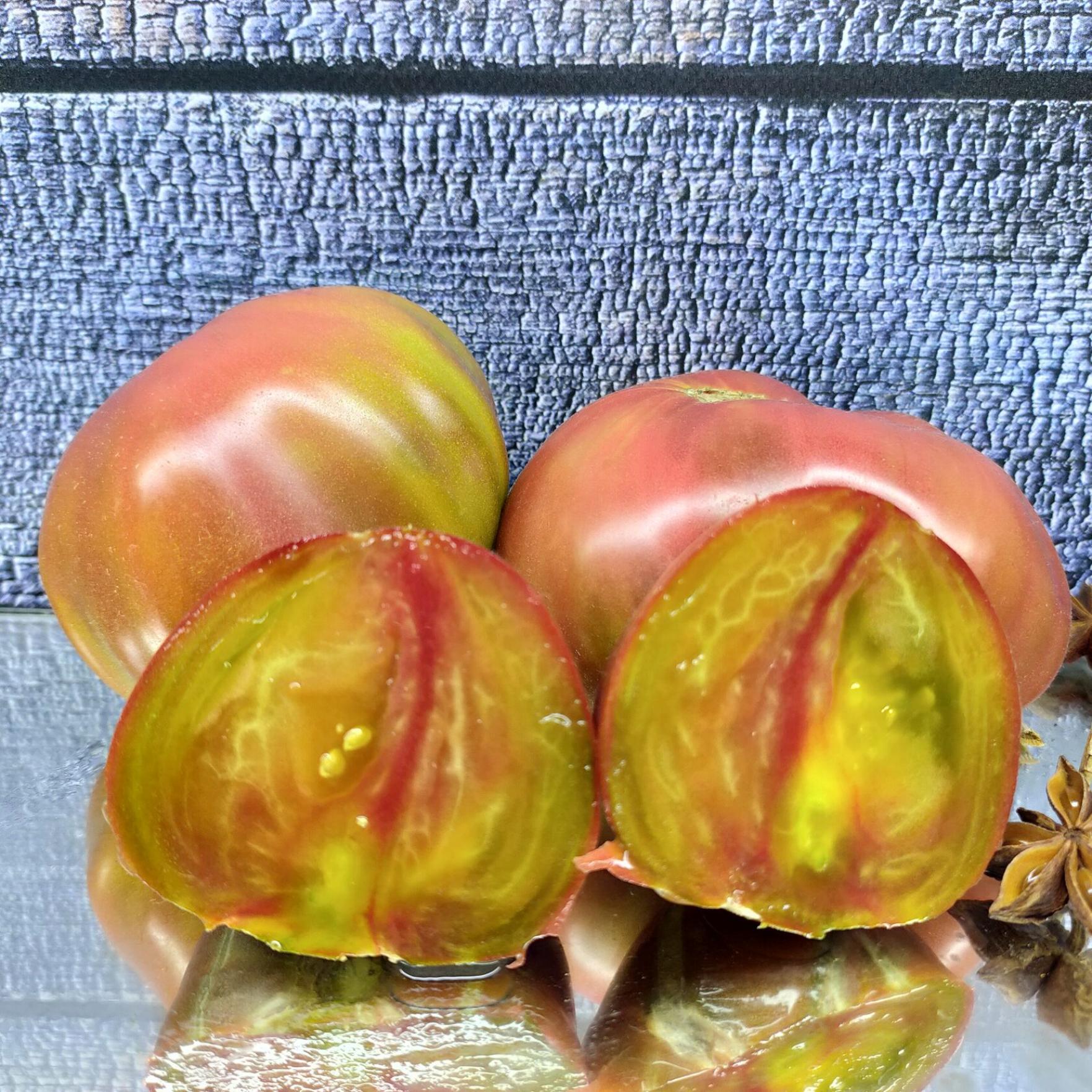 Плоскоокруглые плоды среднего размера отличаются красно-пурпурным окрасом с тонкими зелеными полосами, создающими эффект мраморности. Мякоть плотная, но сочная, с ярким томатным ароматом. Вкусовой баланс смещен в сторону сладости, которую гармонично дополняет легкая кислинка. Такие особенности делают плоды идеальными для употребления в свежем виде, где они раскрывают свою сочность, а также для засолки, консервирования дольками и приготовления кетчупов. Благодаря насыщенному цвету, томатная паста из этого сорта приобретает привлекательный глубокий оттенок.