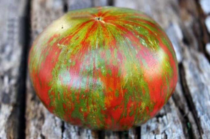 Плоды этой культуры привлекают внимание необычной окраской. В зрелом состоянии их кожица приобретает красно-коричневый фон с легким оранжевым оттенком, покрытый многочисленными прерывистыми полосами зелено-оливкового цвета. Такие растения часто становятся украшением огорода благодаря контрастному сочетанию тонов. Мякоть оливково-зеленого цвета с красно-коричневыми вкраплениями и малиново-розовой сердцевиной добавляет экзотичности. Плоскоокруглая форма плодов, а также их крупные размеры (от 250 г до 500 г) подчеркивают товарную ценность сорта.