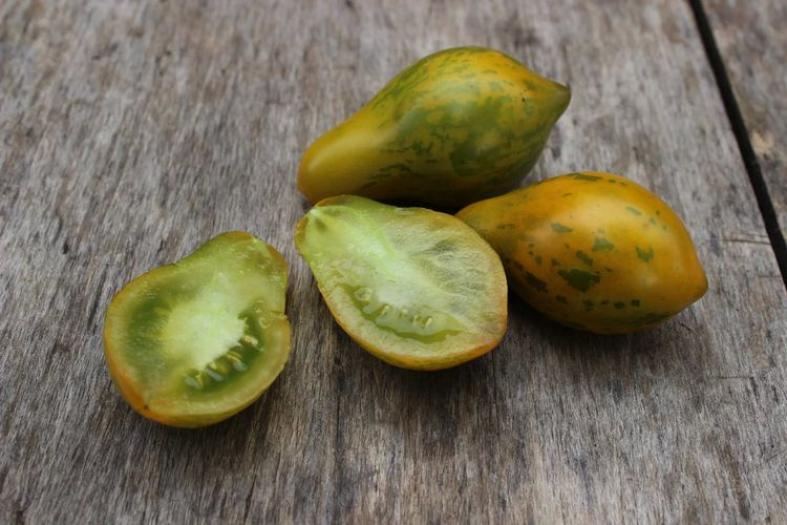 Этот сорт привлекает внимание изумрудным цветом мякоти, который создает контраст с золотистой кожицей, украшенной прерывистыми зелеными полосками. Подобная особенность делает плоды не только вкусными, но и декоративными. Их вытянуто-грушевидная форма с выраженным носиком напоминает миниатюрные фонарики, что особенно ценится в кулинарном оформлении блюд. Небольшой размер позволяет использовать их для цельноплодного консервирования, сохраняя структуру и насыщенный вкус после термической обработки.