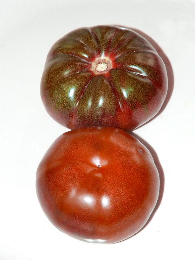 Плоды отличаются плоскоокруглой формой с выраженной ребристостью у плодоножки. Кожица глянцевая, блестящая, что придаёт им привлекательный товарный вид. В фазе полной зрелости окрас становится коричнево-пурпурным с тёмно-зелёными плечиками — такая особенность связана с накоплением антоцианов. Мякоть розово-бордового оттенка, сочная и нежная, с минимальным количеством семенных камер. Вкус характеризуется как насыщенный, с винными нотками и сладковатым послевкусием, что делает плоды идеальными для употребления в свежем виде.