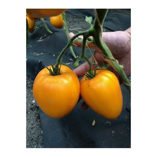 Плоды отличаются сердцевидной формой, что придает им декоративность и делает удобными для нарезки. В незрелом состоянии они имеют светло-зеленый оттенок, который постепенно сменяется насыщенным оранжевым цветом. Мякоть плотная, с однородной структурой и выраженным сладковатым вкусом, лишенным кислинки. Благодаря высокому содержанию бета-каротина, такие плоды не только подходят для употребления в свежем виде, но и идеальны для приготовления соков, сохраняющих яркий цвет и полезные свойства. Каждый плод содержит 3-4 семенные камеры, а на одной кисти формируется до 5-6 экземпляров.