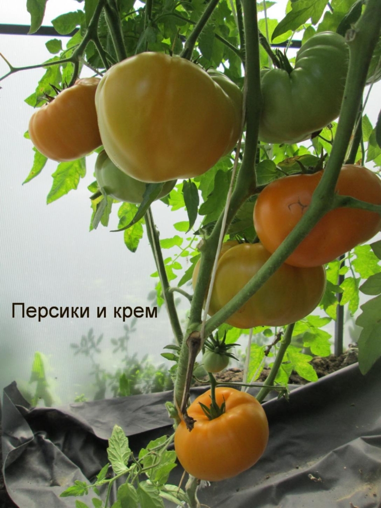 Томат Персики и крем — старинный сорт, созданный в США сообществом амишей, известных своим вниманием к сохранению традиционных сельскохозяйственных культур. Этот сорт долгое время культивировался в закрытых сообществах, что позволило сохранить его уникальные качества. Со временем он привлёк внимание садоводов благодаря сочетанию декоративности и продуктивности. Исторически такие растения выращивались в небольших теплицах или защищённых грунтах, что определило их адаптацию к контролируемым условиям.
