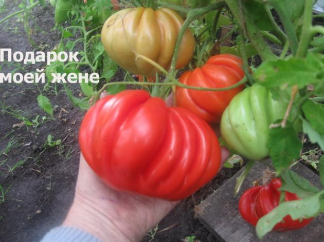 Томат Подарок моей жене — среднеспелый сорт, отличающийся крупными плодами и высокой урожайностью. Это растение формирует крепкие кусты, которые в открытом грунте достигают 150 см, а в тепличных условиях — до 180 см. Для оптимального развития рекомендуется вести культуру в 2–3 стебля, что способствует равномерному распределению ресурсов и повышает качество плодоношения.