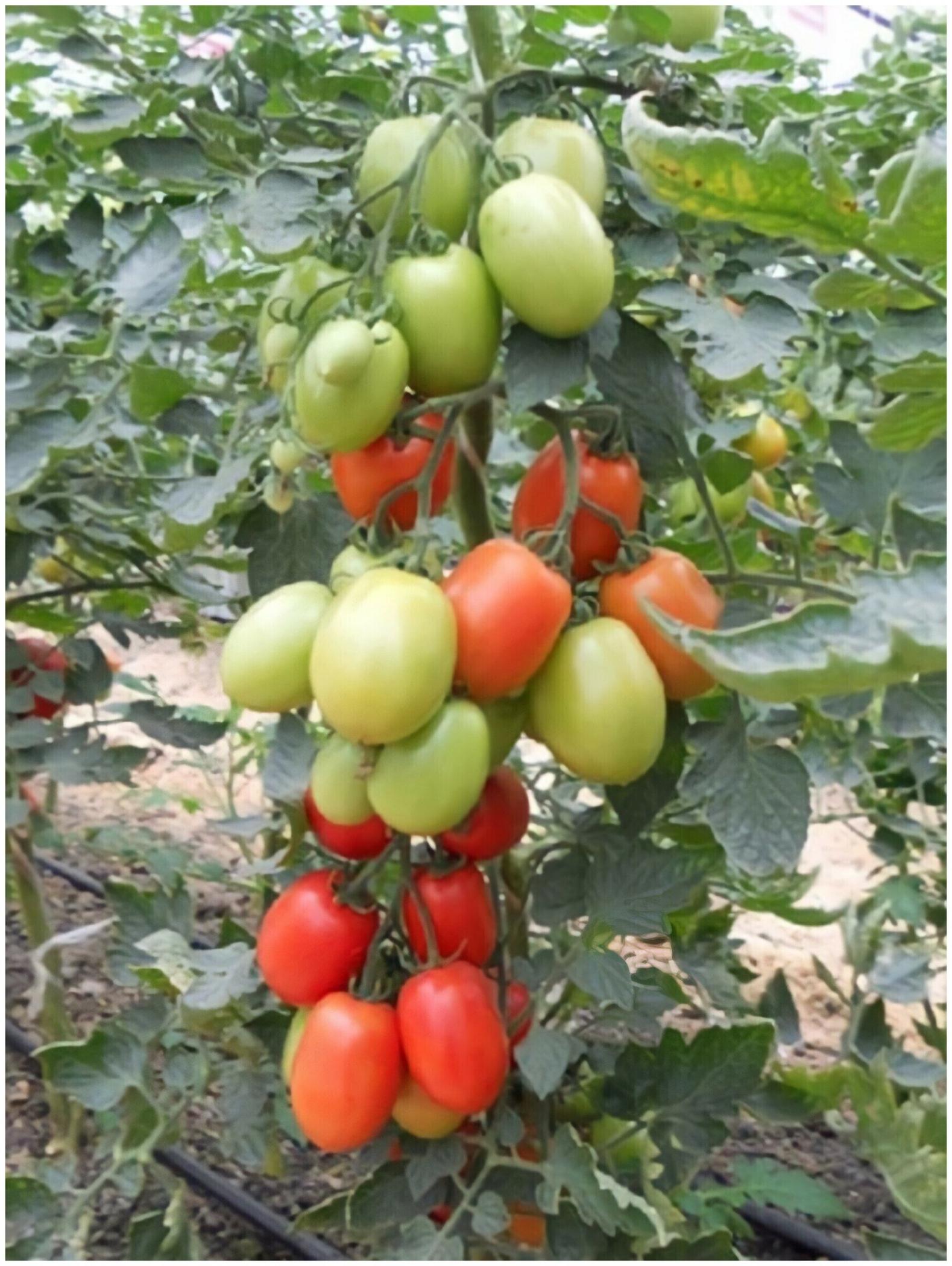 Куст этого растения достигает высоты 160–180 см, что требует обязательной подвязки к опорам. Среднеоблиственные стебли формируют длинные зеленые листья, которые обеспечивают хорошее фотосинтезирование. Первое соцветие закладывается низко — над 6–8 листом, а последующие развиваются через 1–3 листа. При формировании рекомендуется оставлять 1–2 стебля для оптимальной урожайности. Плоды эллиптической формы, мелкие, с гладкой поверхностью. Незрелые экземпляры имеют зеленую окраску с темно-зеленым пятном у плодоножки, а при созревании приобретают равномерный розовый цвет.