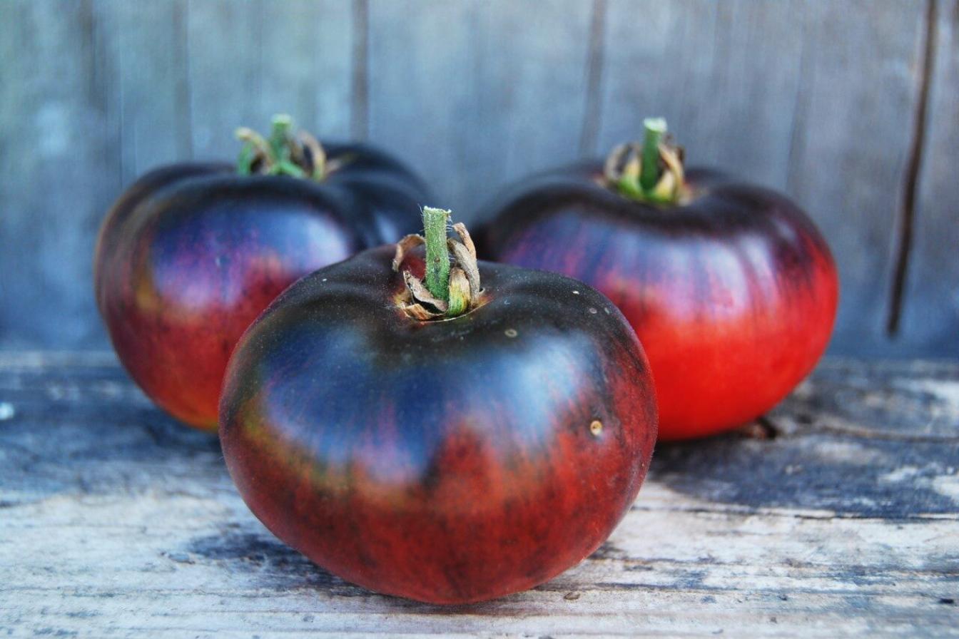 Плоско-округлые плоды выделяются насыщенным красно-бордовым окрасом с участками густо-чернильного оттенка и алыми штрихами. Мякоть мясистая, с высоким содержанием сахаров и выраженным ароматом, что делает вкус гармонично сладким с легкой кислинкой. Внутри каждого экземпляра находится 5–6 семенных камер, которые легко отделяются при обработке. Средняя масса плодов варьируется от 150 до 250 г, а урожайность с 1 кв. м достигает 8–9 кг.