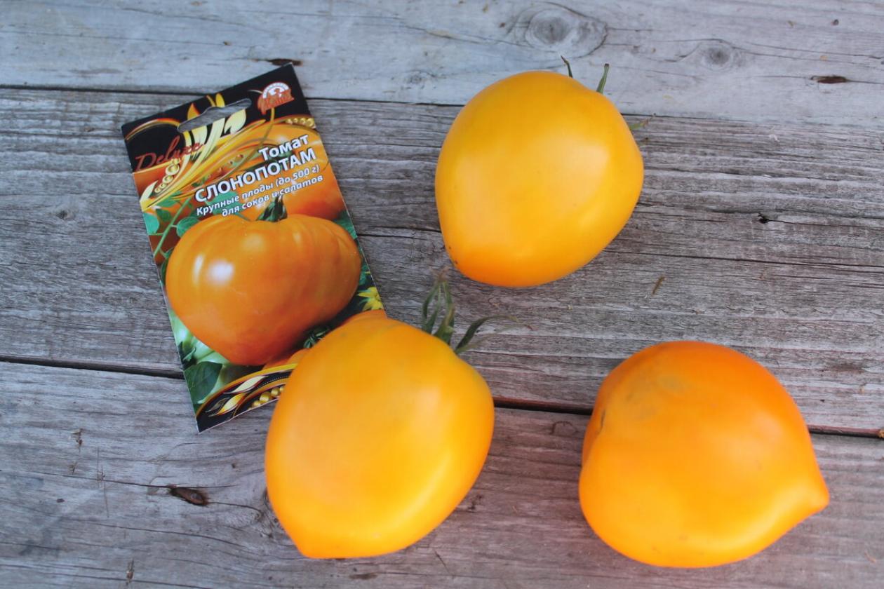 Томат Слонопотам отличается ярким желто-оранжевым окрасом зрелых плодов, которые весят в среднем 300–500 г. Мякоть плотная, мясистая, с минимальным количеством семян. Вкус сладкий, с нотками тропических фруктов и выраженным ароматом, что делает плоды идеальными для свежих салатов, соков и соусов. Благодаря высокой сахаристости и плотной структуре они также подходят для вяления и консервации.
