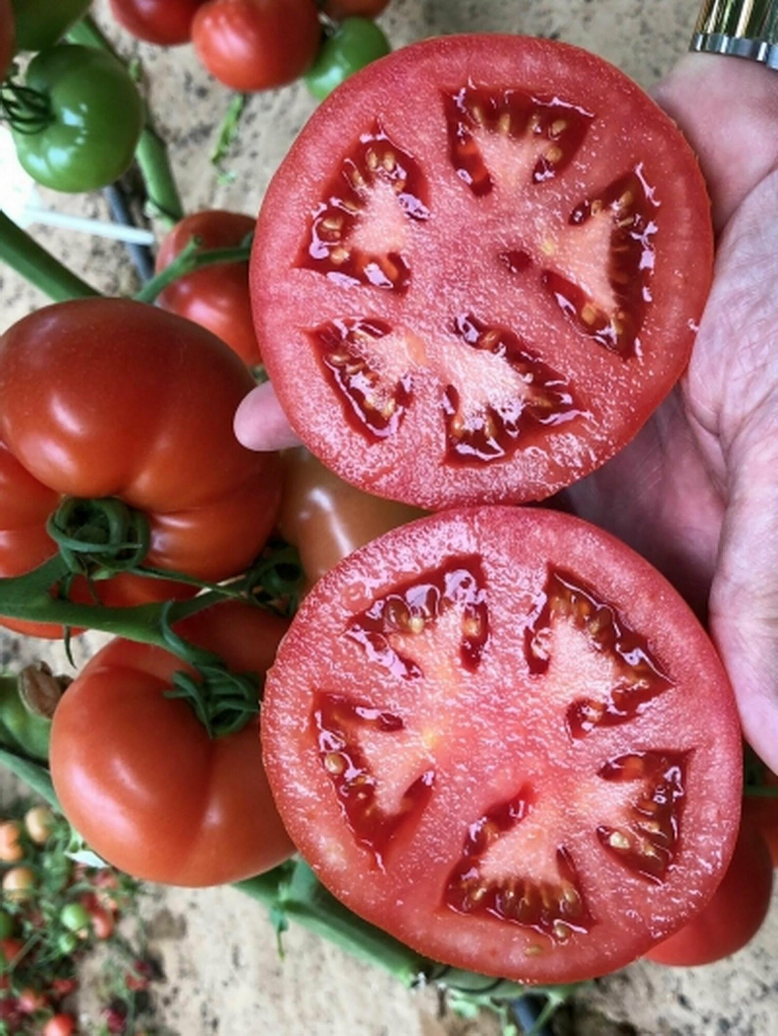 Плоды отличаются плоскоокруглой формой и крупными размерами. В стадии зрелости они приобретают насыщенный красный цвет, а в незрелом виде остаются светло-зелеными без пятен у основания. Гладкая кожица защищает плотную мякоть, которая сохраняет структуру даже при транспортировке. Благодаря отличным вкусовым качествам, такие томаты идеально подходят для употребления в свежем виде — их добавляют в салаты, бутерброды и холодные закуски.