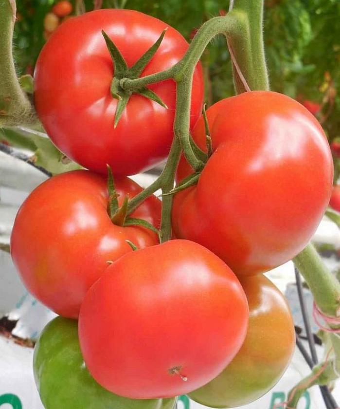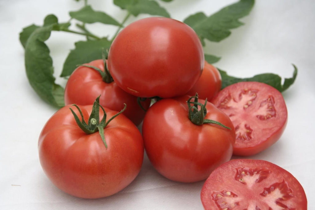 Период созревания среднеспелый: от появления всходов до сбора первых плодов проходит 110–120 дней. На каждой кисти формируется до 6 плоскоокруглых плодов массой 180–250 г. Мякоть средней плотности, сочная, с гармоничным сочетанием сахаров и кислот, что обеспечивает отличный вкус. Кожица гладкая, ярко-красная, устойчивая к растрескиванию. Выход товарных плодов высокий — от 87,7% до 99%, а урожайность варьируется в пределах 9,3–12,1 кг/кв.м при соблюдении агротехники.