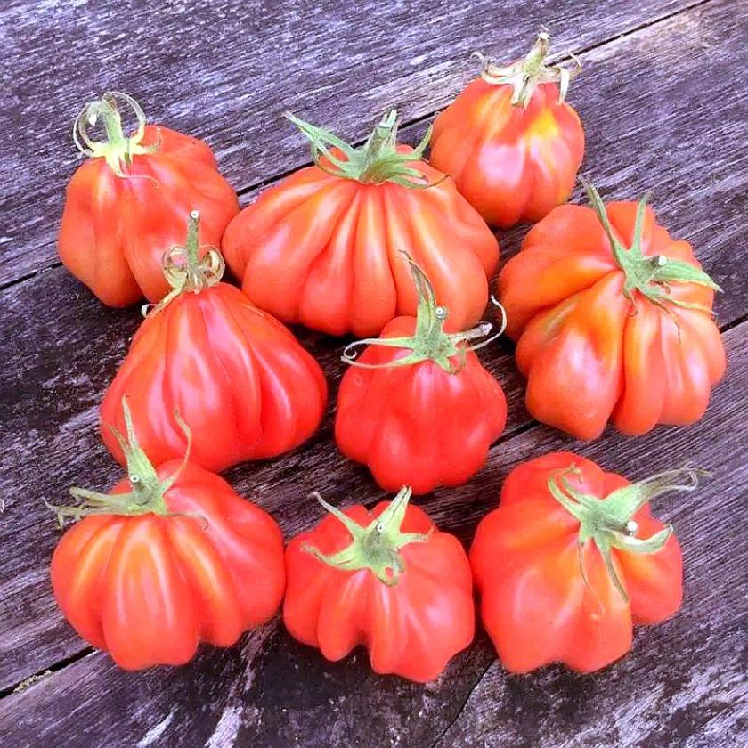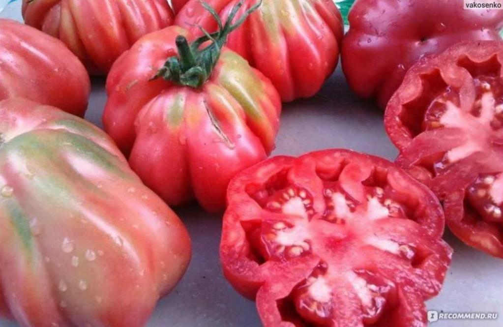 Плоды этой культуры отличаются необычной формой, напоминающей грузинские хинкали с выраженной «гармошкой» из ребер. Каждый экземпляр имеет крупные размеры, средняя масса варьируется от 200 до 300 г. Кожица гладкая, с глянцевым блеском, который сохраняется даже после полного созревания. Мякоть плотная, малинового оттенка, с высоким содержанием сахаров — вкус доминирует сладость, а легкая кислинка практически отсутствует. На одной кисти формируется 6–7 завязей, что обеспечивает обильный урожай при соблюдении агротехники.