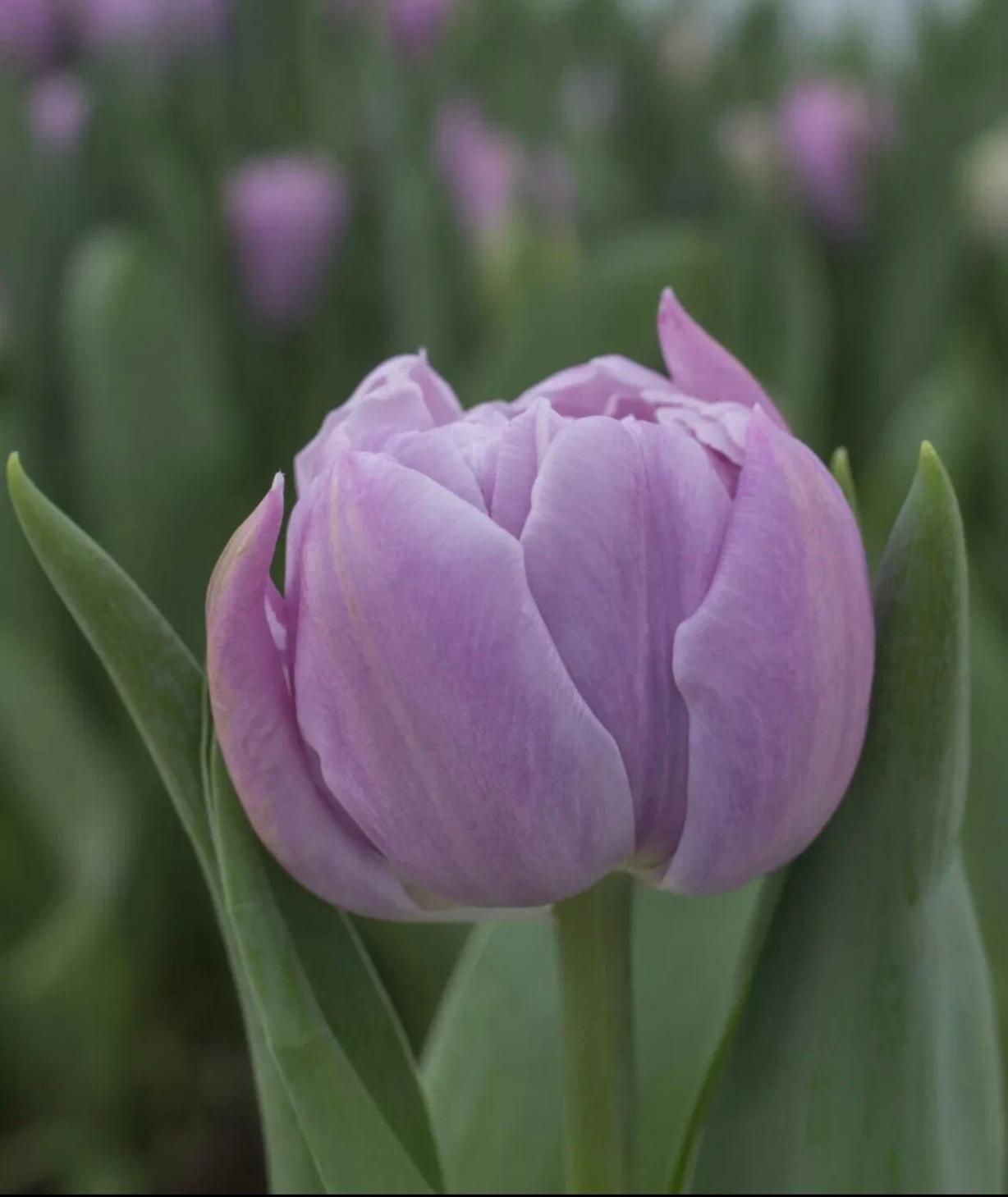 Компактные кусты высотой 35–45 см с крупными цветами гармонично вписываются в альпинарии, бордюры и клумбы. Их часто используют в групповых посадках, сочетая с нарциссами, мускари или низкорослыми многолетниками. Нежные сиреневые оттенки создают контраст с желтыми и белыми сортами, а прочные стебли позволяют формировать сложные цветочные композиции. В ландшафтном дизайне такие тюльпаны высаживают вдоль дорожек или в качестве акцента в рокариях.